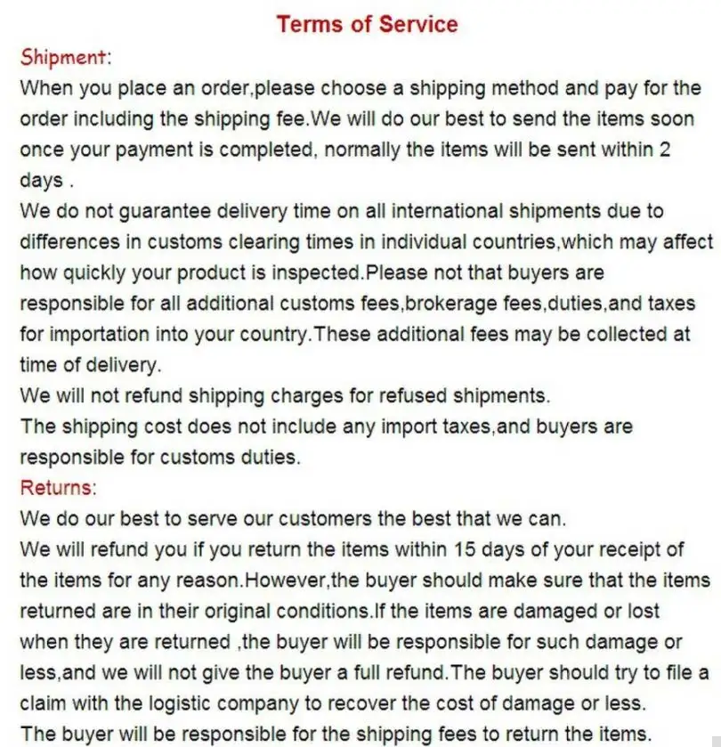 • If you did not receive the product within the guaranteed time( 45 days not including 2-5 day processing) you can request a refund or a reshipment.